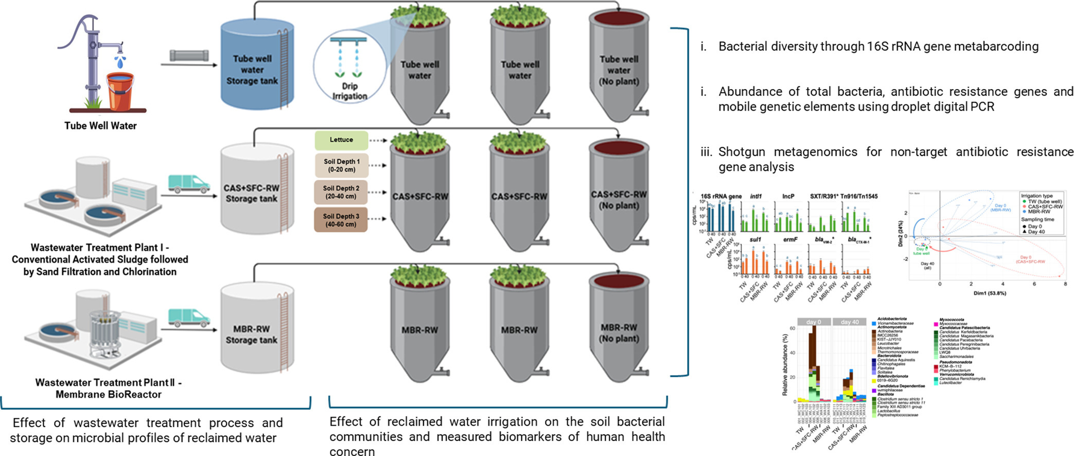 Reclaimed water (RW) offers a sustainable solution for agricultural irrigation and freshwater conservation, but its microbial and chemical composition, shaped by treatment and storage processes, requires careful consideration for environmental and public health impacts. This study compared two RW types (conventional activated sludge with sand filtration and chlorination – CAS+SFC-RW – and membrane bioreactor – MBR-RW) with a tube well (TW) water control. The goal was to assess how storage influences the microbial composition, key antibiotic resistance and mobilome genes, and RW the impact on irrigated lysimeter soils during lettuce cultivation. Total bacteria were profiled using 16S rRNA gene sequencing and ddPCR, while antibiotic resistance genes (ARGs) and mobile genetic elements (MGEs) were quantified by ddPCR and analysed by metagenomics. Initial RW samples had 1-1.5 orders of magnitude more 16S rRNA copies compared with the control, with significantly different bacterial and ARG/MGE profiles. Actinomycetota dominated CAS+SFC-RW, Bacteroidota the MBR-RW, and Pseudomonadota the TW water. Class 1 integrons and Tn916/Tn1545 were more abundant in CAS+SFC-RW compared with the MBR-RW. Storage reduced these differences toward convergence with the TW water profile, with putative pathogenic taxa, however, being more recalcitrant to change. RW irrigation altered soil bacterial composition, with MBR-RW having a greater impact as declared by the enhanced presence of Bacteroidota in the receiving soils. The RW influence was inversely related with vertical distance of the irrigation point, while the lettuce crop presence showed minimal/no impact. These results highlight the need for careful management of RW treatment and storage to ensure safe, resilient agricultural practices.